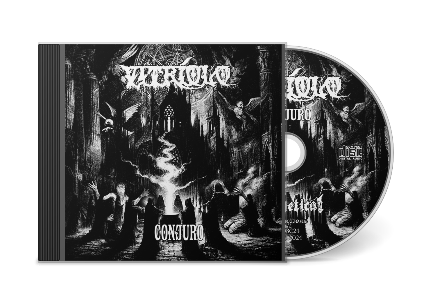 Hailing from Lisbon, the Portuguese project Vitríolo released their debut full-length album, Conjuro, on April 28, 2024, through Prophetical Productions. This record is the work of the multi-instrumentalist Fred F., who is also known for his role in the project Void of Apep. The music is a raw and menacing blend of Black, Death, and Thrash Metal, specifically crafted with a no frills approach that emphasizes primitive energy and a blasphemous atmosphere. Written entirely in Portuguese, the lyrics delve into themes of demonolatry and witchcraft, adding a layer of occult ritualism to the band's aggressive sound. The album consists of seven tracks, including Lucífugo, Olho do Caos, and the title track Conjuro, resulting in a concise and focused 25 minute experience. The songwriting is characterized by sharp, thrashy riffing and raspy vocals, often incorporating rock-and-roll elements that give the songs a gritty, high-octane edge without sacrificing their dark, blackened core. Released as a limited edition of 200 CDs, the physical version features a 12 page booklet containing lyrics and artwork that reflect the project's interest in the dark arts. Conjuro has been noted in the underground for its uncompromising spirit and its ability to channel the classic filth of the 80s extreme metal scene while maintaining a uniquely Lusitanian identity.